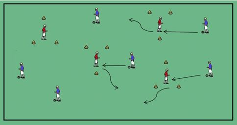 Ćwiczenie dla średniozaawansowanej grupy. Podania bez przyjęcia, z przyjęciem podeszwą, zewnętrznym podbiciem, kierunkowe wewnętrzną częścią stopy. Różne formy przyjęcia piłki, od 3′ ćwiczenie dla zaawansowych technicznie.